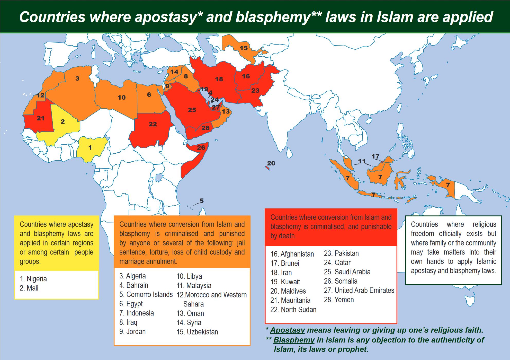 The following countries have criminal statutes that forbid apostasy or blasphemy: