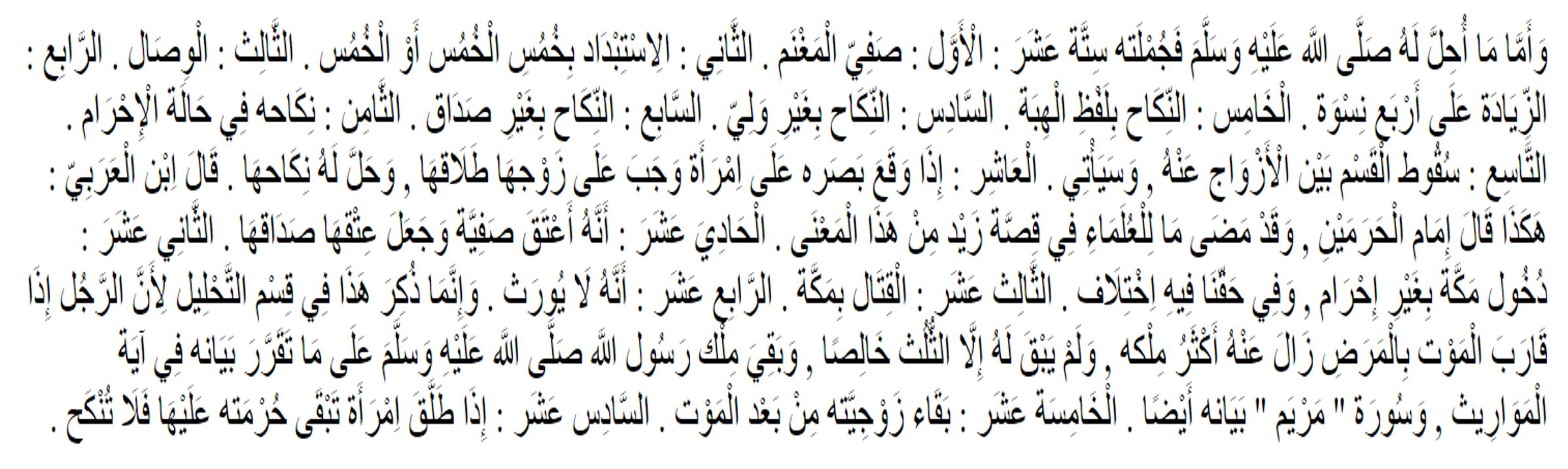 - Fourteenth: That he is not inherited by anyone at all. This was mentioned in the oath of absolution for when a man approaches death due to illness, most of his possessions are taken away, so that he does not have more than a third left for him. But the possessions of the prophet remained for him, as is evidenced in the verse of inheritance and in Surat Mariam.